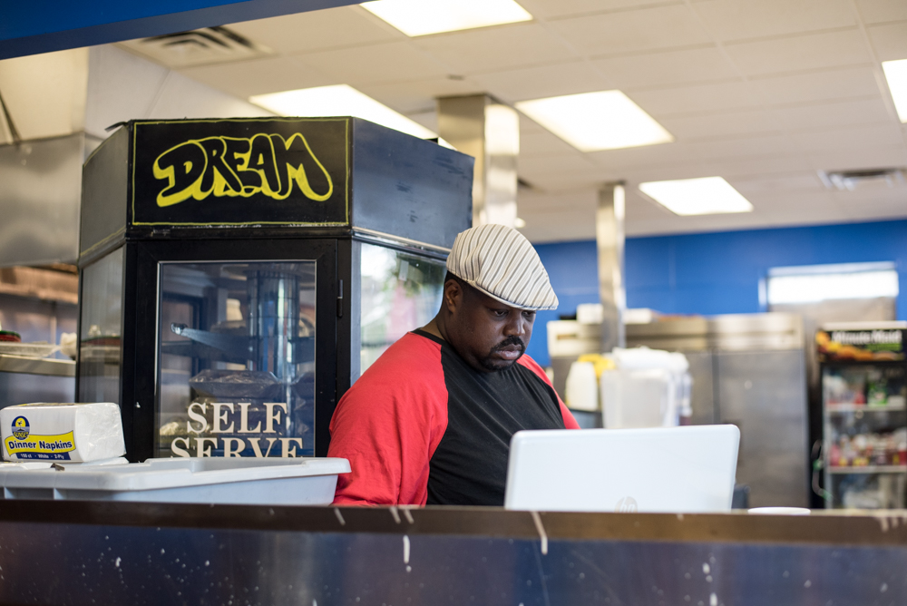 Dream Cafe & Grill manager Duane Powell runs the cafe’s counter. As a longtime DJ he also selects music for customers to enjoy.