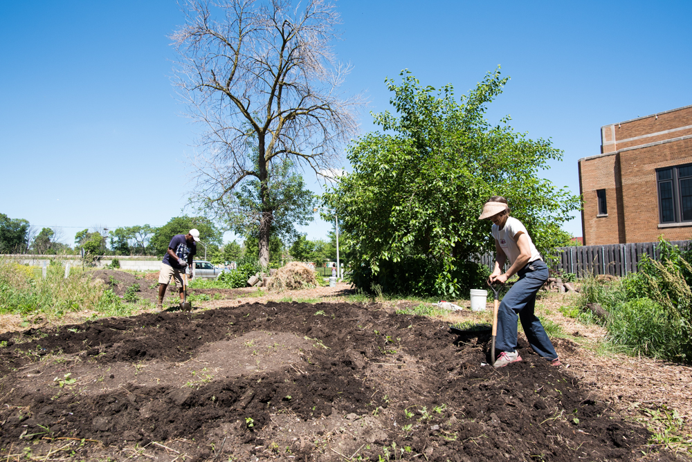 Urban gardens and farms like Eat to Live (E2L) on Princeton Avenue, making use of vacant lots, have become more commonplace in Englewood. In addition to providing greens and other food to local organizations like the Institute of Women Today, Martha Boyd (right) says E2L is focused on providing gardening education and creating a local food supply.