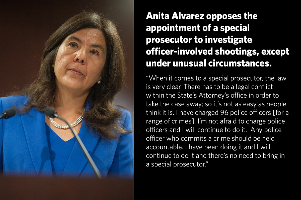 Cook County State’s Attorney Anita Alvarez is the elected official responsible for prosecuting police-misconduct cases. Alvarez came under fire for waiting almost two years to charge Servin, the first Chicago cop in almost 20 years to be prosecuted for the fatal shooting of a civilian. And when she did, a judge threw the case out, saying she’d mishandled it. More recently, Alvarez was criticized for waiting 13 months to charge the police officer who killed teenager Laquan McDonald.