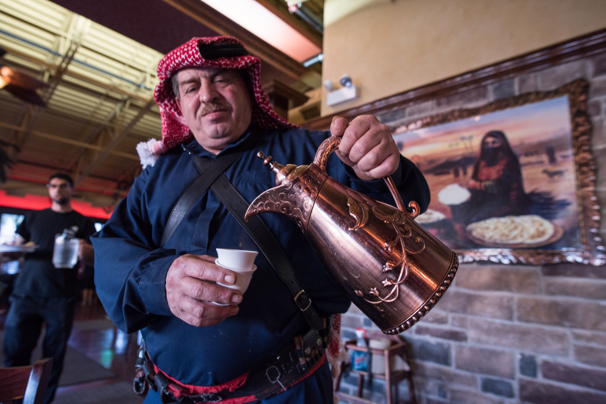 Mahmood Frihat serves traditional Arabic coffee to customers at Al Bawadi Grill in Bridgeview.